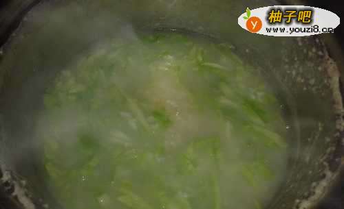4大约20分钟后,粥开始变得粘稠,将准备好的圆白菜一同放入锅中煮10分钟左右即可。