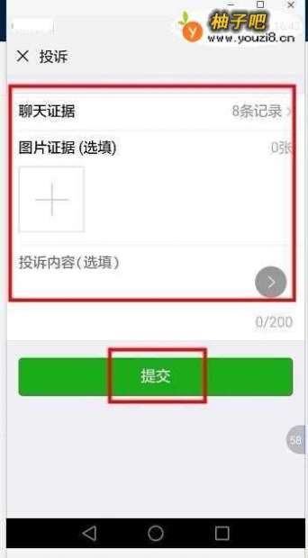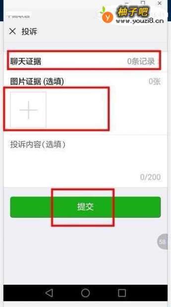 9点击后进入如下窗口,按照提示可以进行提交聊天证据与图片证据,完成后再点击下方的:提交 绿色按钮,进入第二张页面内;可以看到提交成功后会有一个投诉已提交 页面,等待审核消息。