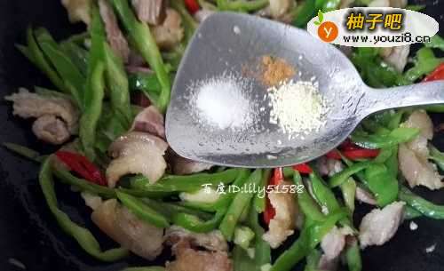 6放入少许盐、鸡精、五香粉,加入一点点清水烧开,把青椒和肉翻炒入味,关火。