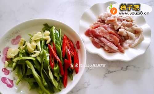 2把五花肉切好,肥瘦分开放。青椒切丝,红尖斜切。