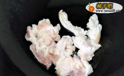 3烧热锅放入油,把肥肉先放进锅里,用大火煸炒出油。
