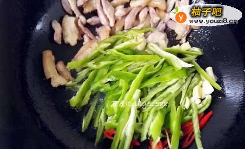 5瘦肉炒到七八成熟的时候,把青椒和红尖椒一起放到锅里,用大火快速翻炒1分钟。