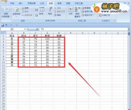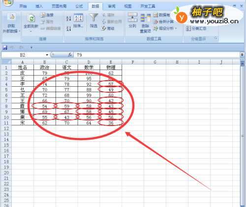 9在下拉菜单中,选择“圈释无效数据”单击后,所有低于60分的成绩都被红圈圈出来了