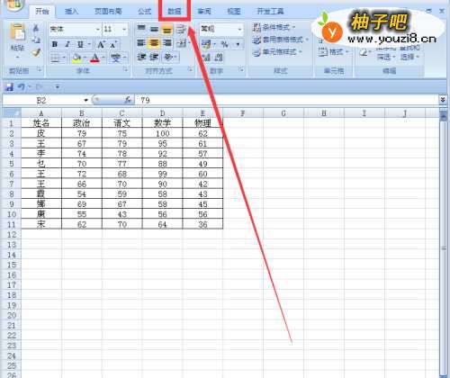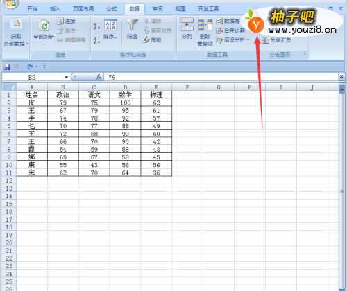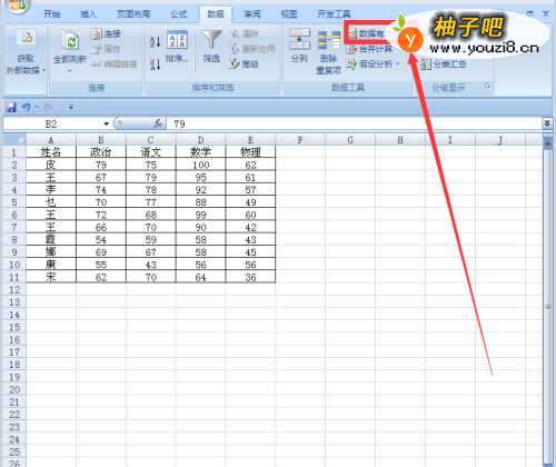 8选中菜单栏“数据有效性”后面的下拉箭头,单击