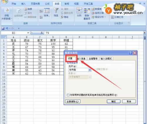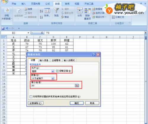 7在设置选项卡中进行如下设置:“允许”中选择“整数”,“数据”中选择“大于或者对于”,“最小值”选择“60”。选择时,在相应的数据框中单击下拉箭头就可以找到相应选项。选择结束,单击“确定”