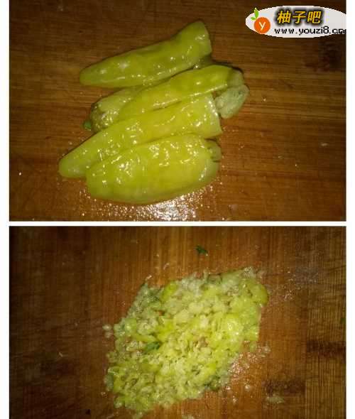 3准备一些泡椒小米辣,把小米辣帽子去掉,然后全部剁细备用。