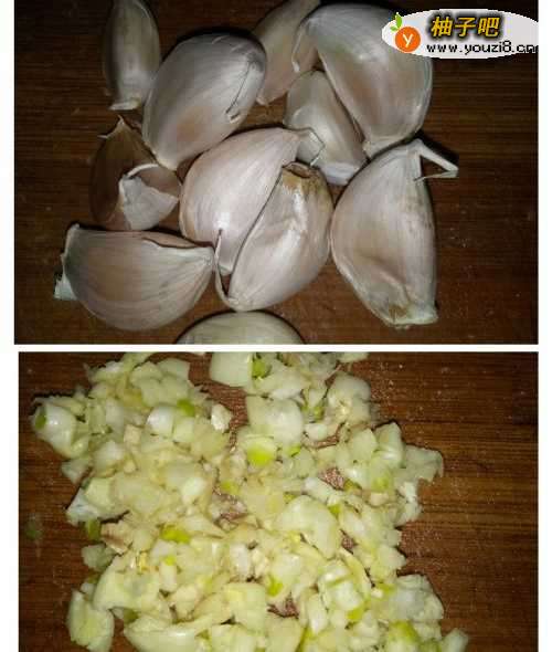 2准备多一点大蒜,用刀全部把它砸扁,皮就会离开,然后剁成蒜末备用。