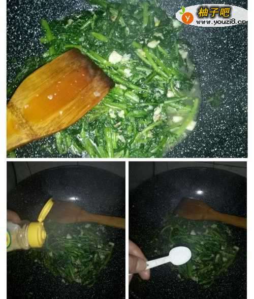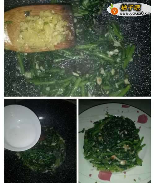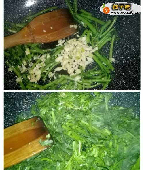 4锅里放油,油温五成热时加菜杆翻炒,加蒜末翻炒,再放入菜叶。