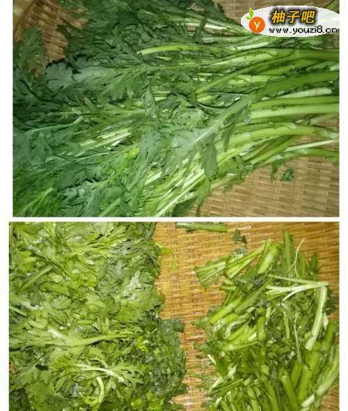准备新鲜的茼蒿菜,洗净,切成七厘米长条,菜叶和菜杆分开。