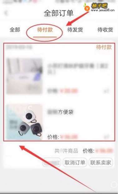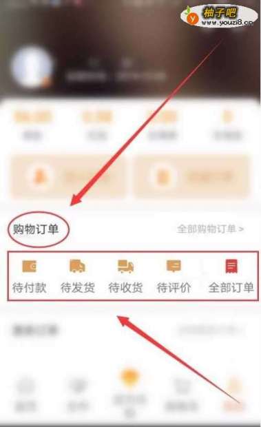 购物订单选项下,可以分类查看待付款、待发货、待收货、待评价和全部订单。