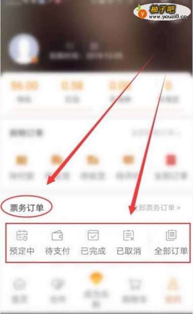 票务订单选项下,可以查看购票订单,分为待付款、待发货、待收货、待评价,以及全部订单。