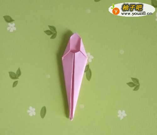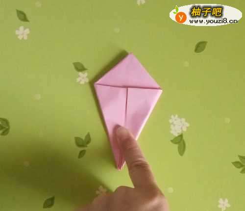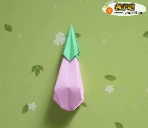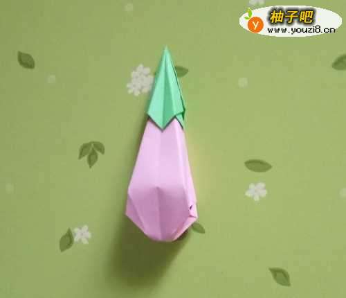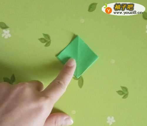 5现在拿绿色纸来折茄子的叶子,与步骤2、3一样的折法,只不过折的位置上下相反,如图所示。