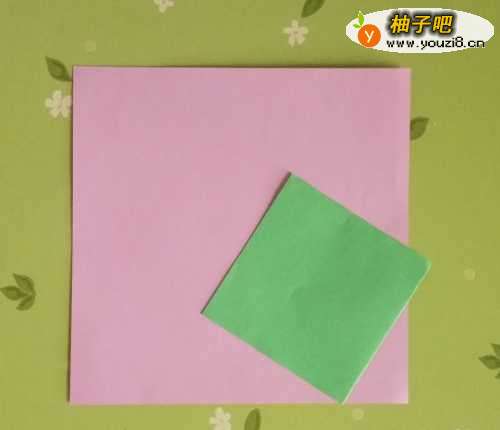 准备一大一小的正方形彩纸,小的是大的四分之一,如图所示。