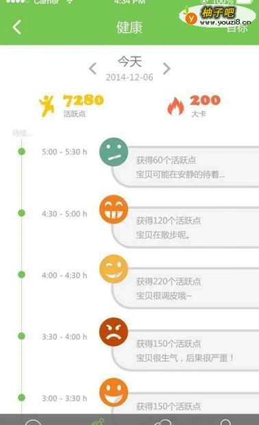 可查看宝贝当天的运动量及消耗的卡路里,同时也可了解宝贝的历史运动量及消耗卡路里的曲线变化