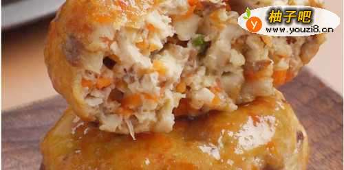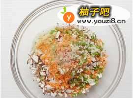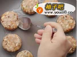 鸡肉馅里加入香菇末、胡萝卜末、葱花、姜末,放一个鸡蛋清,加入盐和白胡椒粉,充分搅拌均匀。然后用筷子把肉馅抹平整,用勺子画线,平均分成8份,挖出一份,捏成厚实的小肉饼。