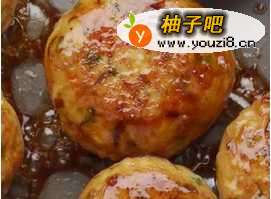 2在平底锅里放油,放入鸡肉饼,盖上锅盖煎到底面有点金黄,然后翻过来盖上锅盖继续煎。
