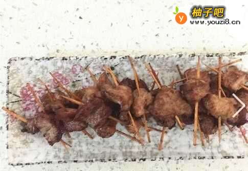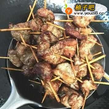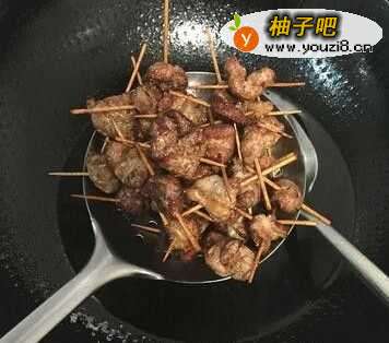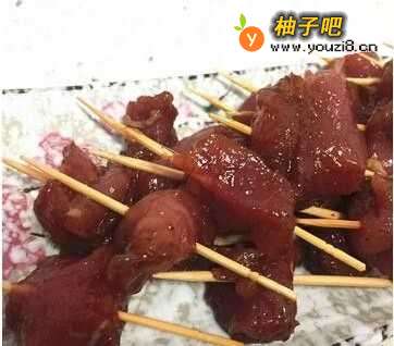 5牙签开水烫过后,把肉肉一块一块串起来。牙签肉就是这么来的。