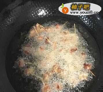7等油冒烟后调至小火,加入牙签肉。等肉全部进锅后继续开大火炸。