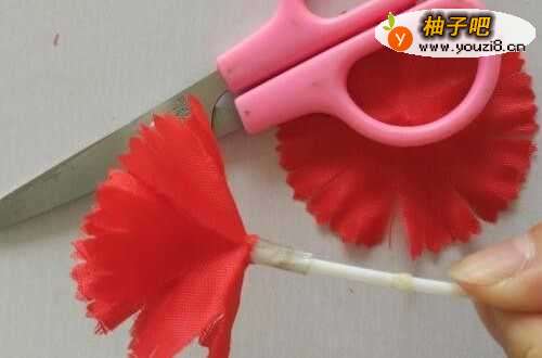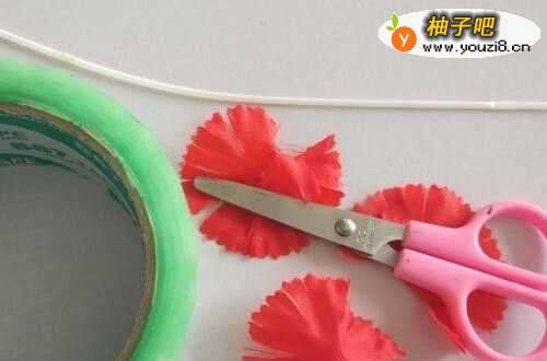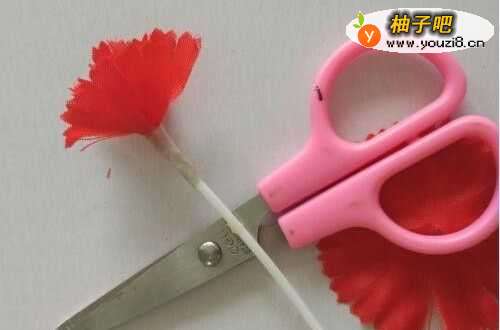 再第二片花瓣中间一样的挖一个洞,然后穿入塑料小管,也是用胶布黏住,注意这时候花瓣不需要拧得很紧,松松的就可以了,给人一种盛开的花朵的感觉。