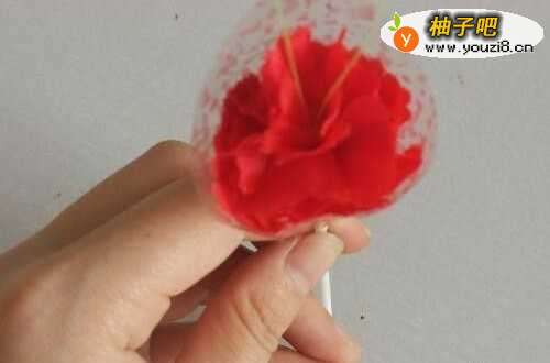 最后在用一张漂亮的糖果纸把花围住,这样一朵漂亮的手工花就做好了。如果有条件可以再加一个荧光塑料棒。