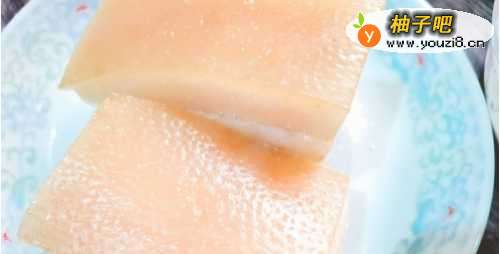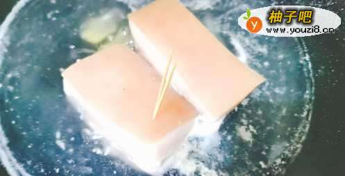 6把炸好的五花肉放至准备好的冷开水中泡几秒钟。