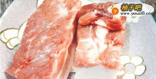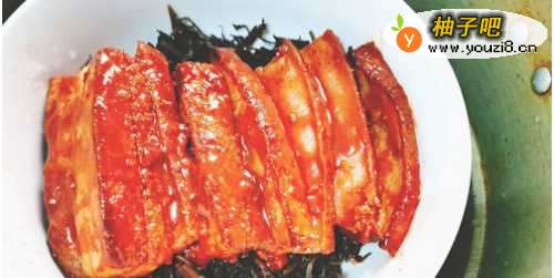 9把切好的五花肉放在酱料碗里,抹上酱料。