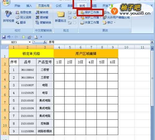 5、选择【审阅】菜单→【保护工作表】。