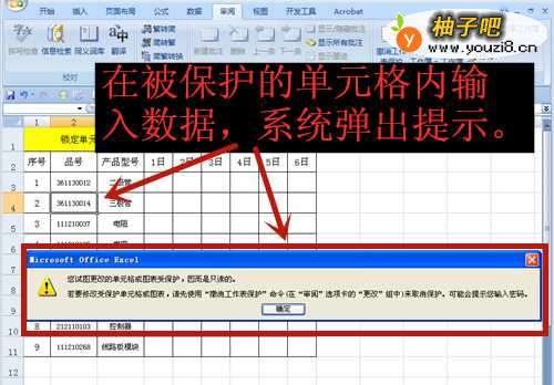 8尝试在被保护的单元格内输入数据,系统则弹出以下提示信息。