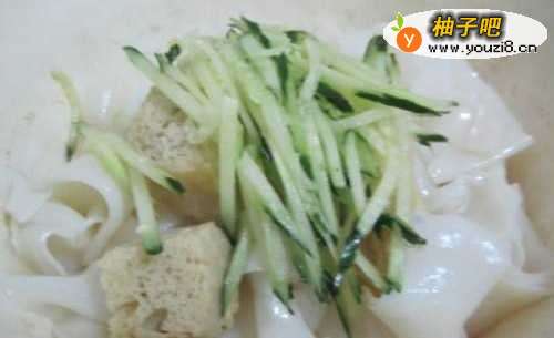 4将准备好的冻豆腐和黄瓜丝都放入面皮的碗中
