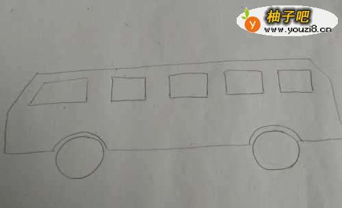 4画好车轮,我们在画上窗户,窗户四四方方的。