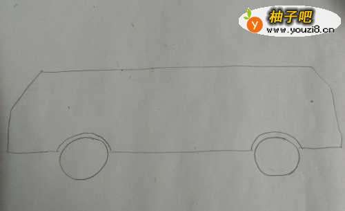 3画好车身的大体轮廓后,我们再来画车的轮子,先画上两个半圆与车身连接,接着在画上两个圆圈。