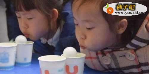 幼儿园老师们可以用乒乓球在水杯上吹球比赛,让孩子站在在一张桌子前,然后用力吹动面前的乒乓球到前面的装水的杯子中,吹得最远的为胜,这个游戏可以锻炼孩子的肺活量。