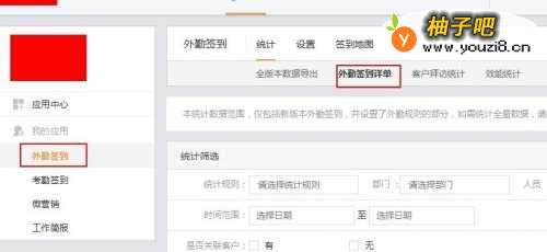 4左侧选择外勤签到,选择外勤签到详单,筛选部门或者个人、时间截止点。
