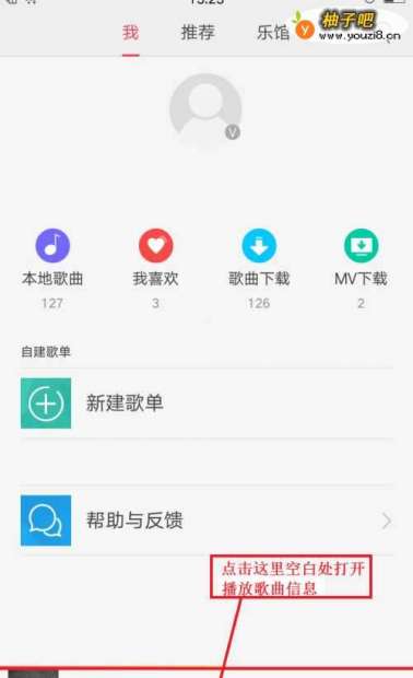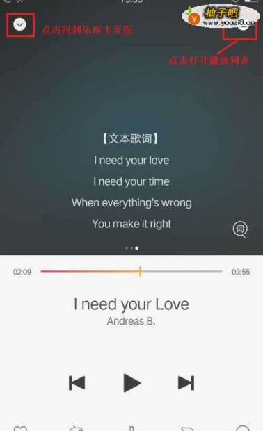 3在播放信息页面如果要回到乐库主页面占点左上角的下拉菜单;如果要打开播放列表点击右上角的”三“图标。