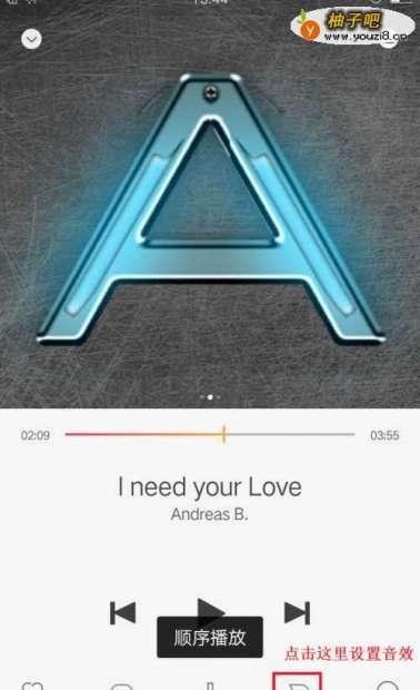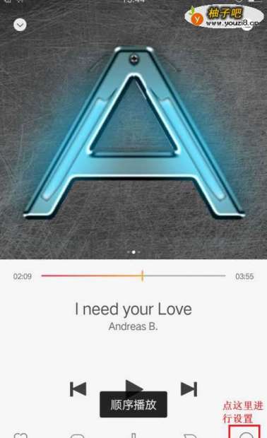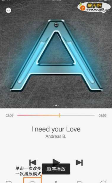 4设置播放模式:要想单曲循环播放、全部循环播放、随机播放或顺序播放,就点击大半圆图标,每点一下就换一种播放模式,并有文字提示。