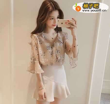 搭配三:粉色系带雪纺衫+白色包身短裙粉色系带雪纺衫是很温柔、甜美的衣服,适合淑女小姐姐,搭配一条白色包身短裙更显甜美和洋气。
