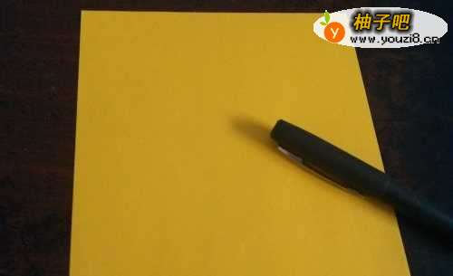 先准备好一张正方形的彩纸,一支笔。先把彩纸的对角线对折,如图二。