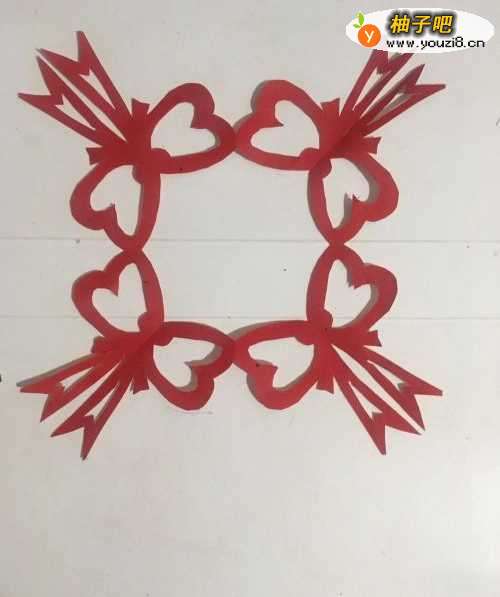 6第六步 剪完外围多余的彩纸部分之后 再剪里面的镂空部位 和边缘部分 还有前腿涂实的地方 都剪完之后 展开压平 一副美观漂亮的蝴蝶结方花图案就剪好了