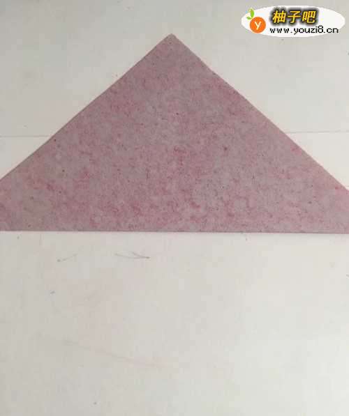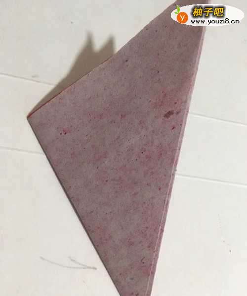 第一步 首先把一张15厘米长 15厘米宽的正方形红色彩纸一张 竖起来对角摆放 然后从下向上对角折叠