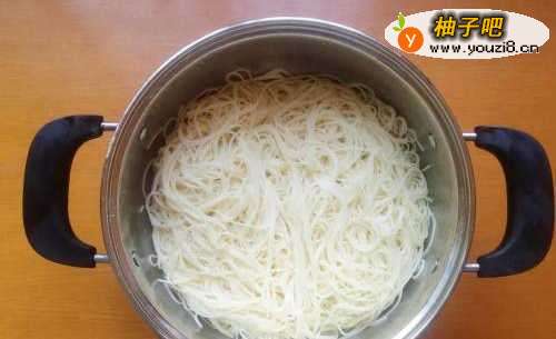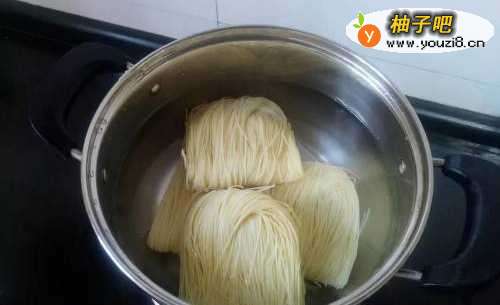3将煮好的鸡蛋面捞出,过一下凉水,然后再控干水分,倒入适量的食用油,翻拌均匀待用,这样可以防止面条粘成一坨。