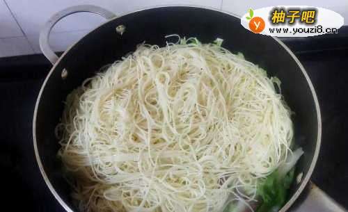 6然后倒入大白菜、青辣椒和面条,继续用大火爆炒,这里建议用筷子来炒,比较方便,而且可以一边挑起面条抖散,一边来炒,这样炒出来的成品会根根分明。