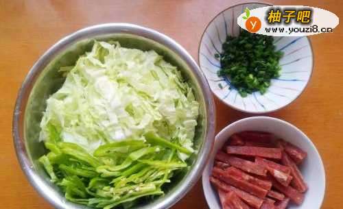 先来处理食材,把大白菜洗干净后切成条状,青辣椒洗净切丝,牛排肉洗净切成条,香葱洗净切成葱花。这里的肉一定要买牛排肉,容易熟且嫩。