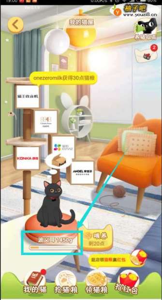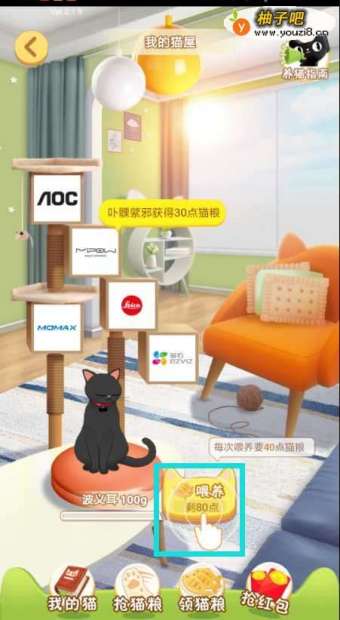 喂猫的猫粮需要去各大店铺参加他们店铺首页的小游戏获取奖励来获得。