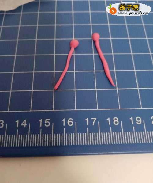 6同样颜色的粘土搓两个细条和小球,制作小虫子的两个触角