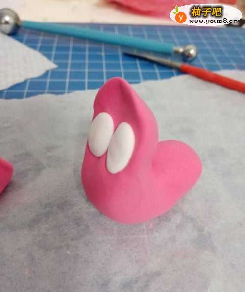 3在头部压两个凹下去的部分,用白色粘土做一个扁扁的圆球,黏在窝内,做出眼睛,黑色粘土制作瞳孔部分