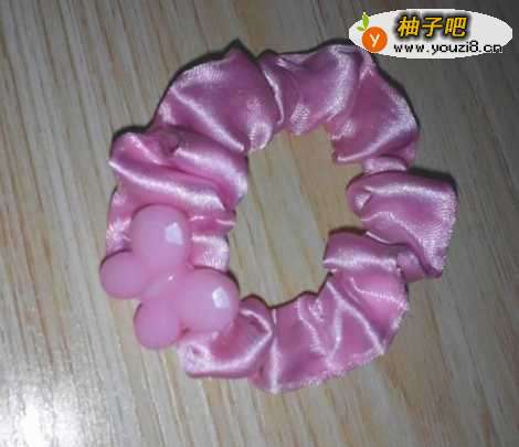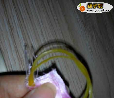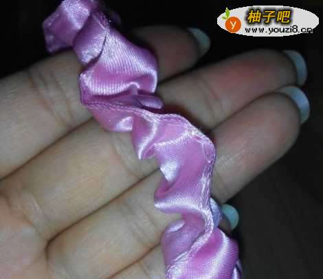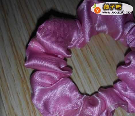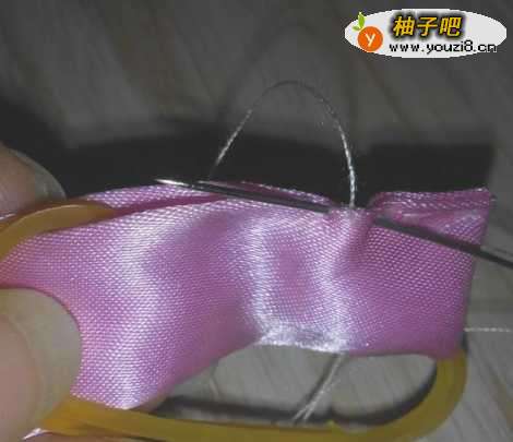 4找跟粉色的线,用针线把绸带开口缝合起来。(皮筋就藏在绸带里了)