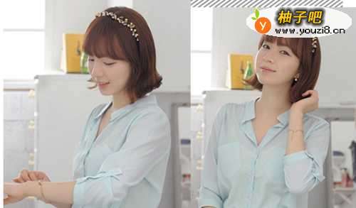 8空气感齐刘海长度到眉毛位置,同时发尾蓬松外翘让短发更加灵动活泼,再搭配精致的发箍,整体看起来超美的。