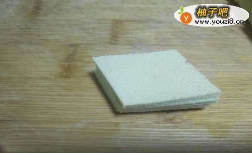 首先准备豆皮2张,切成尽量等大的菱形,然后热水焯水1分钟,去除豆腥味!