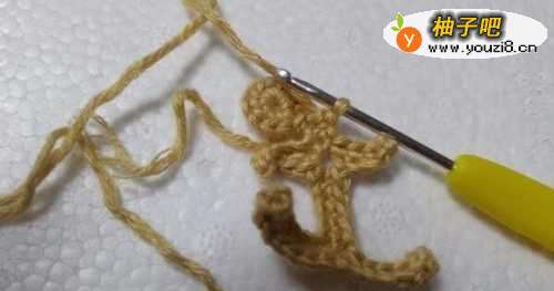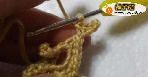 7再拉5个辫子针,在倒数第2针里看是顺次钩织4个短针。
