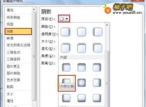 4弹出【设置图片格式】对话框→选择左侧的【阴影】→在右侧【预设】图标处点选下三角形→选择【内部左侧】如下图所示。